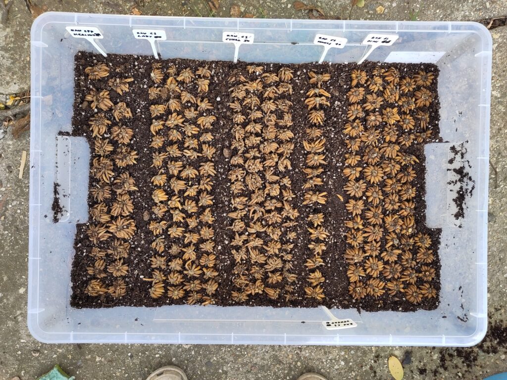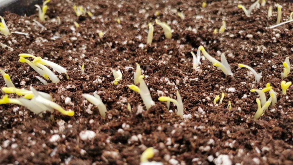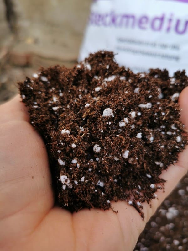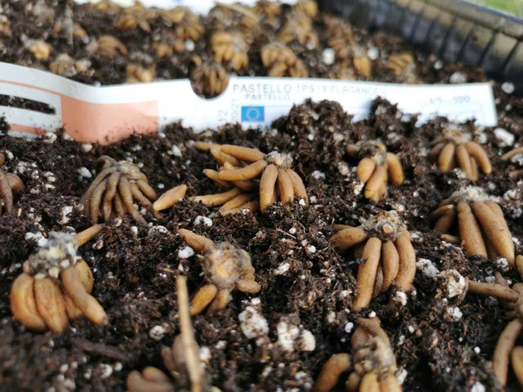 Presprouting requires a very light and airy growing medium, which does not contain too many nutrients and stimulates the good root formation. Cutting medium (Steckmedium) from the German company Klasmann-Deilmann is my go to presprouting medium. If I wouldn’t have access to it, I would mix a high-quality seeding medium in a 1:1 ratio with perlite. I moisten the substrate, but take care not to overdo it. When you form a lump in your hand and squeeze it, the water should not drop out of it. Otherwise, there is a risk that the excessive moisture would cause the corms to  rot instead of sprouting.
