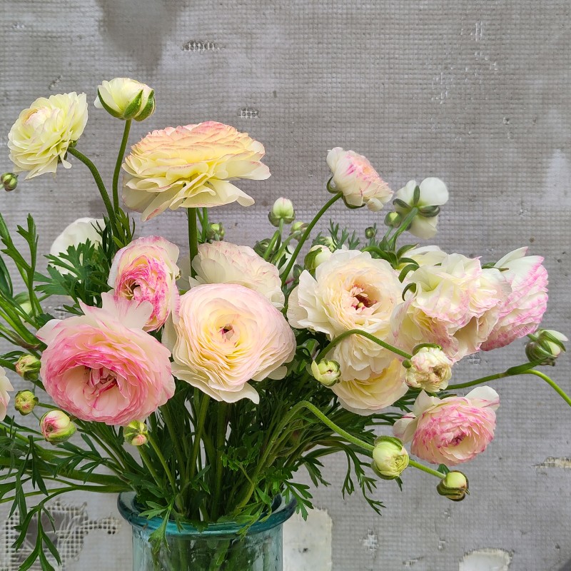 When harvesting ranunculus, the right phase depends on the specific use. The Italian producer of corms from the Elegance® and Cloni Success® lines recommends waiting till the bud opens and closes twice before harvesting. I prefer to use the ranunculus in different stages of flowering in my bouquets and arrangements, so I harvest closed, nicely developed buds as well as fresh, fully opened flowers. The shelf life of freshly harvested ranunculus is amazing, they last as long as two weeks in a vase for me.