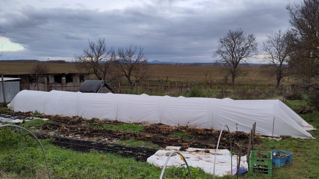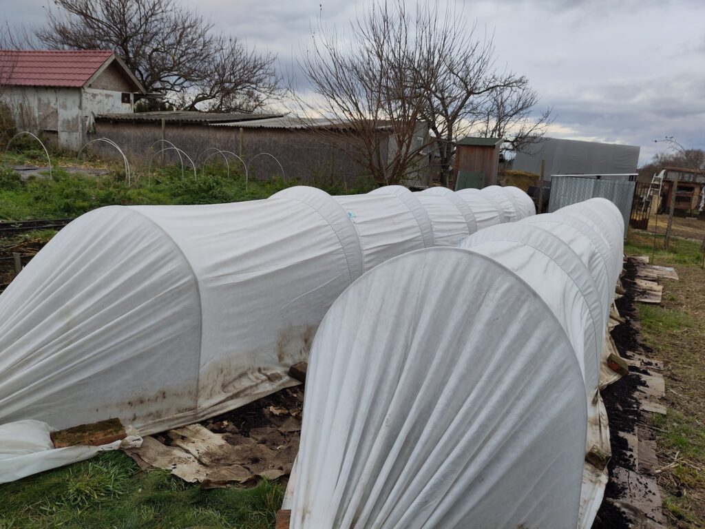 The plants planted in the autumn need good protection from frost. Although they can tolerate temperatures below freezing (some sources say they can handle temperatures as low as -6 degrees Celsius without protection), the prolonged frosts weaken the plants and reduce our spring harvest. I plant some of the fall plants in a polycarbonate greenhouse and some are placed in low tunnels outdoors. To create a low tunnel, I stretch and attach a 50 g/m2 agrotextile over aluminum hoops. Constructing a low tunnel is a topic for a separate blog, so I won’t go into getails here. If you want to see the detailed process, Tony Gaetz from Bare Mountain Farm has an excellent series of videos on YouTube.